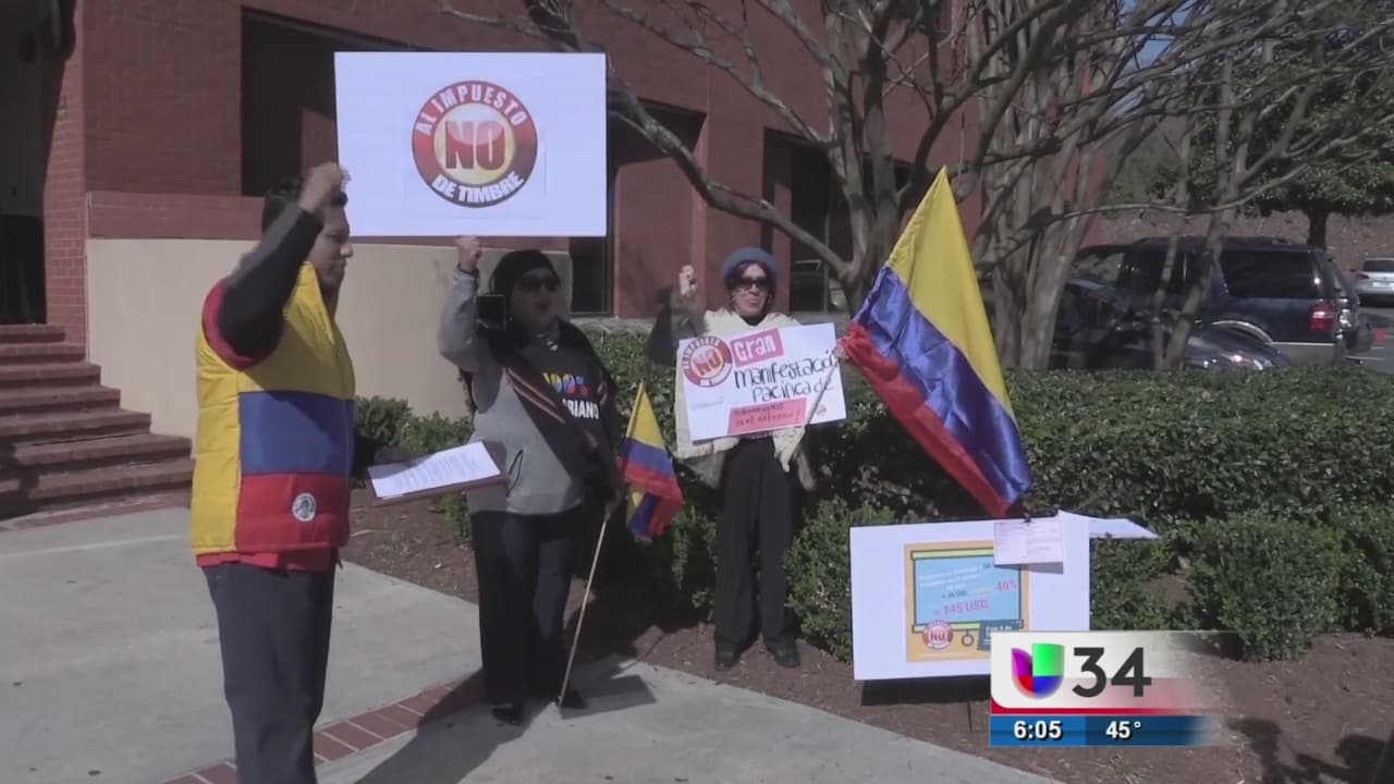 El aumento del 10 por ciento en el trámite de documentos en los consulados de Colombia, llevó a un grupo de manifestantes a protestar contra el incremento frente al consulado en Atlanta.
