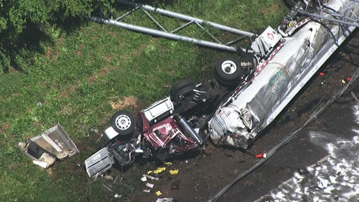 El accidente hizo que el camión cisterna derramara el combustible que transportaba por toda la carretera, dijeron las autoridades.