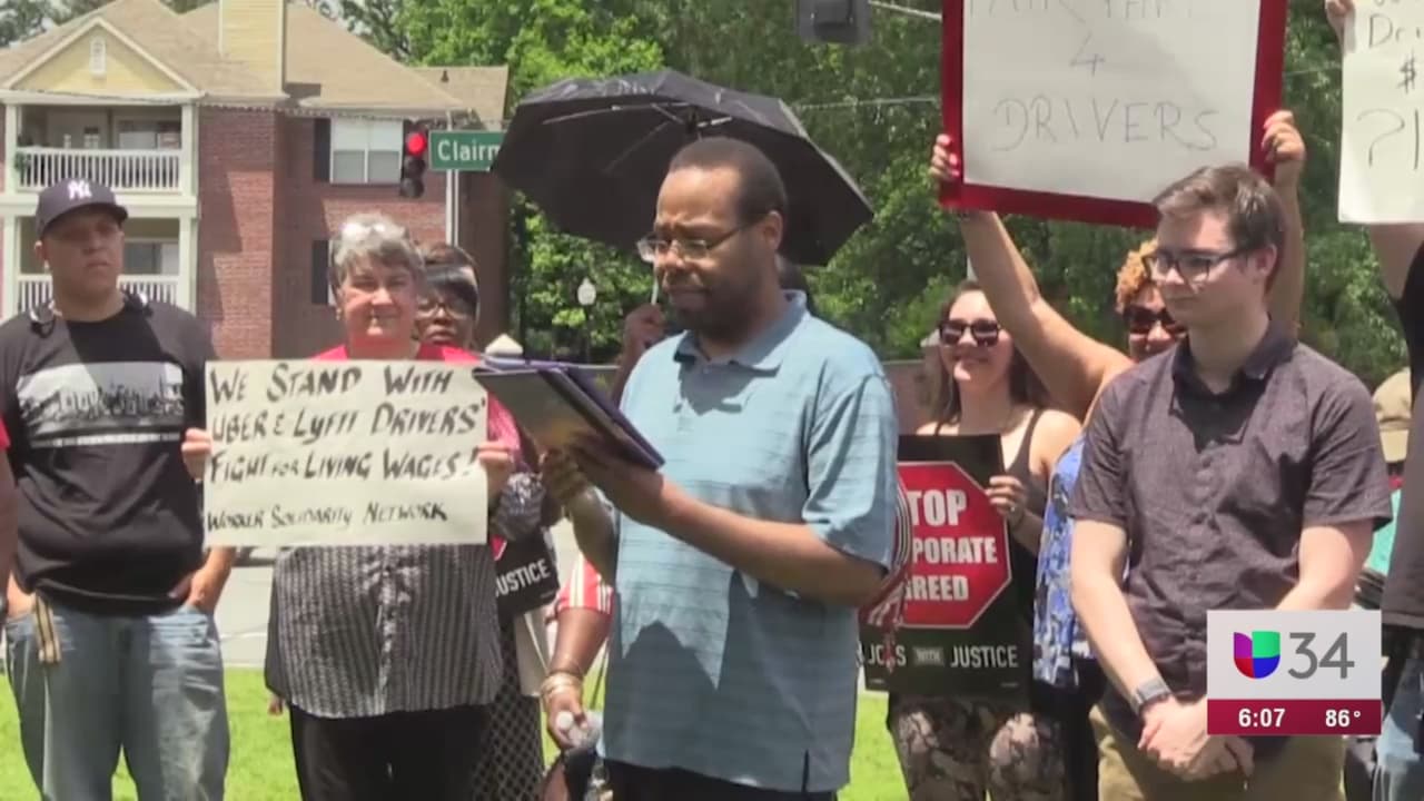 Conductores que trabajan para las compañías de servicios de viajes compartidos Uber y Lyft en Atlanta protestaron este miércoles. Ellos se unieron a una huelga global para externar su descontento con las políticas de las empresas y exigir mejores condiciones.