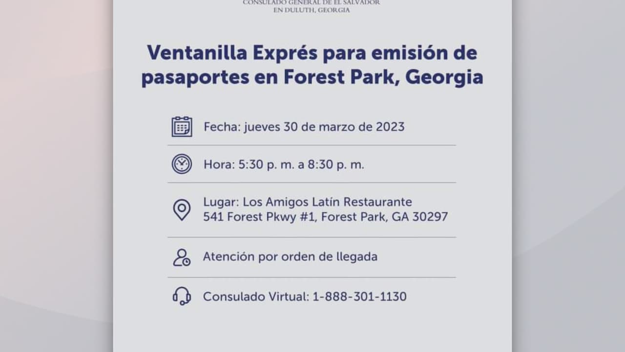 El consulado de El Salvador en Georgia estará realizando una Ventanilla Exprés para la emisión de pasaportes en Forest Park este jueves 30 de marzo. La cita es a partir de 5:30 de la tarde y hasta las 8 de la noche en el restaurante Los Amigos. La atención será por orden de llegada.