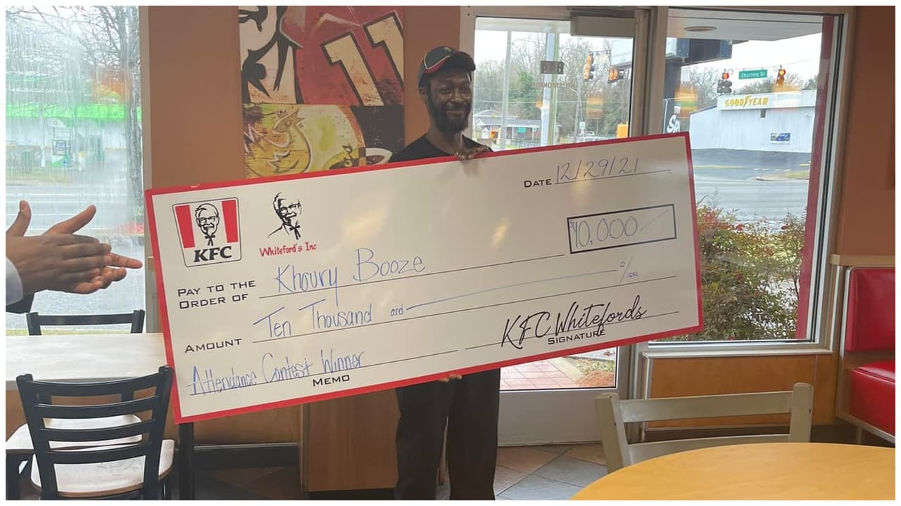 Un empleado de KFC en Shurling Drive en Macon, Georgia, llamado Khoury Booze ganó $10.000 por nunca faltar al trabajo. Usará el dinero para arreglar su carro y irse de vacaciones con sus hijos. Esta es su historia.