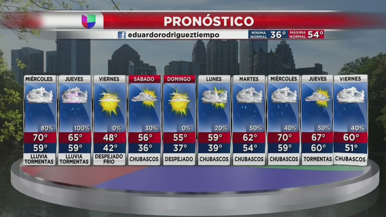 Las temperaturas se mantendrán relativamente altas durante este miércoles y las lluvias fuertes comenzarán a partir de la noche. El jueves será un día completamente lluvioso y se espera que tenga tormentas de moderadas a fuertes. La acumulación de agua en el área metropolitana de Atlanta podría rondar entre las 2 y 5 pulgadas.