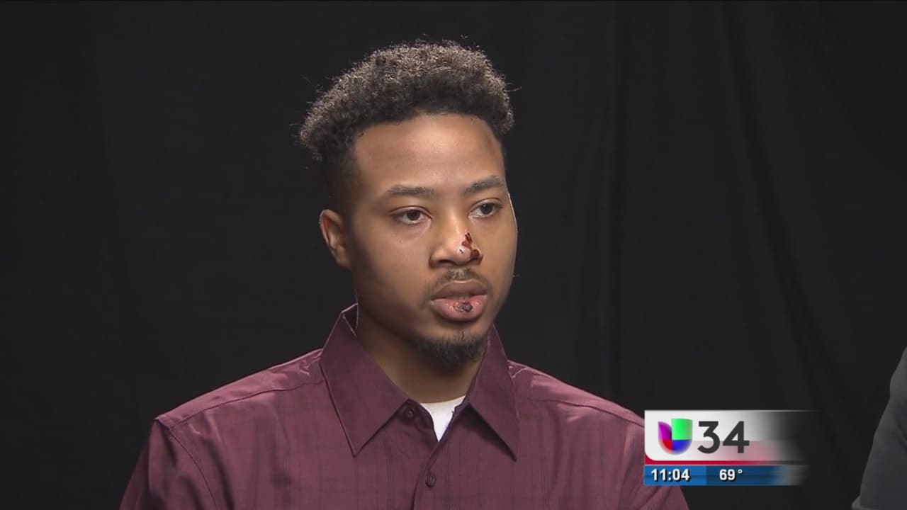 Demetrius Hollins de 21 años cuenta cómo fue presuntamente golpeado en la cara por un agente mientras otro lo pateaba.