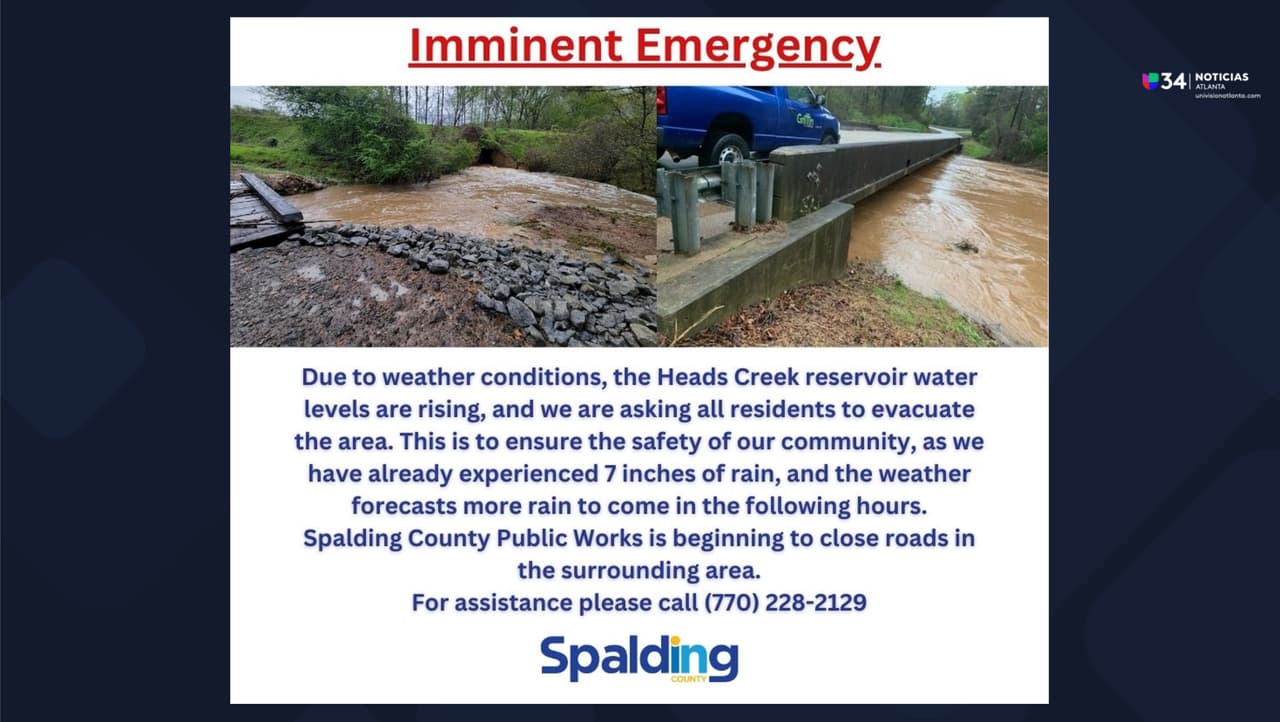 "Debido a las condiciones climáticas, los niveles de agua del embalse de Heads Creek están aumentando y estamos pidiendo a todos los residentes que evacuen el área. Esto es para garantizar la seguridad de nuestra comunidad, ya que hemos experimentado 7 pulgadas de lluvia y el clima pronostica más lluvia en las próximas horas... Para obtener ayuda, llame al Departamento de Bomberos del Condado de Spalding al (770) 228-2129", indicó el alguacil del condado Spalding.