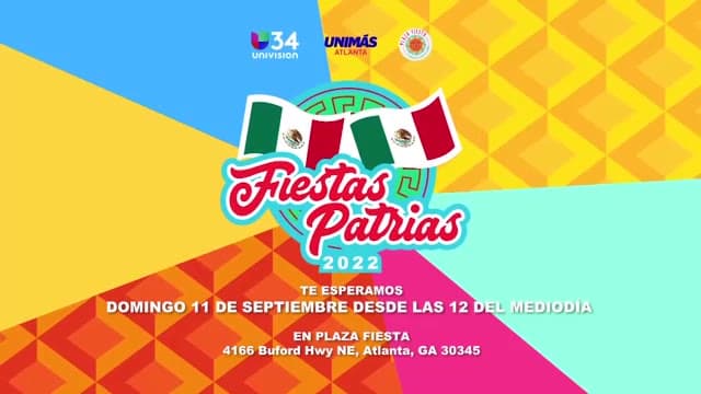 ¡Llegó el mejor evento del año! Univision 34 y UniMás Atlanta te invitan a celebrar nuestra herencia hispana y a festejar en el evento más importante del año ¡Fiestas Patrias!, será un evento familiar, lleno de música y mucha diversión para toda la familia, la cita es el domingo 11 de septiembre a partir del mediodía en Plaza Fiesta.