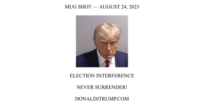 La campaña de Trump está aprovechando la publicación de la histórica fotografía policial del expresidente, que rápidamente se volvió viral. La campaña ha introducido una gama de productos que muestran de forma destacada su foto de reserva.