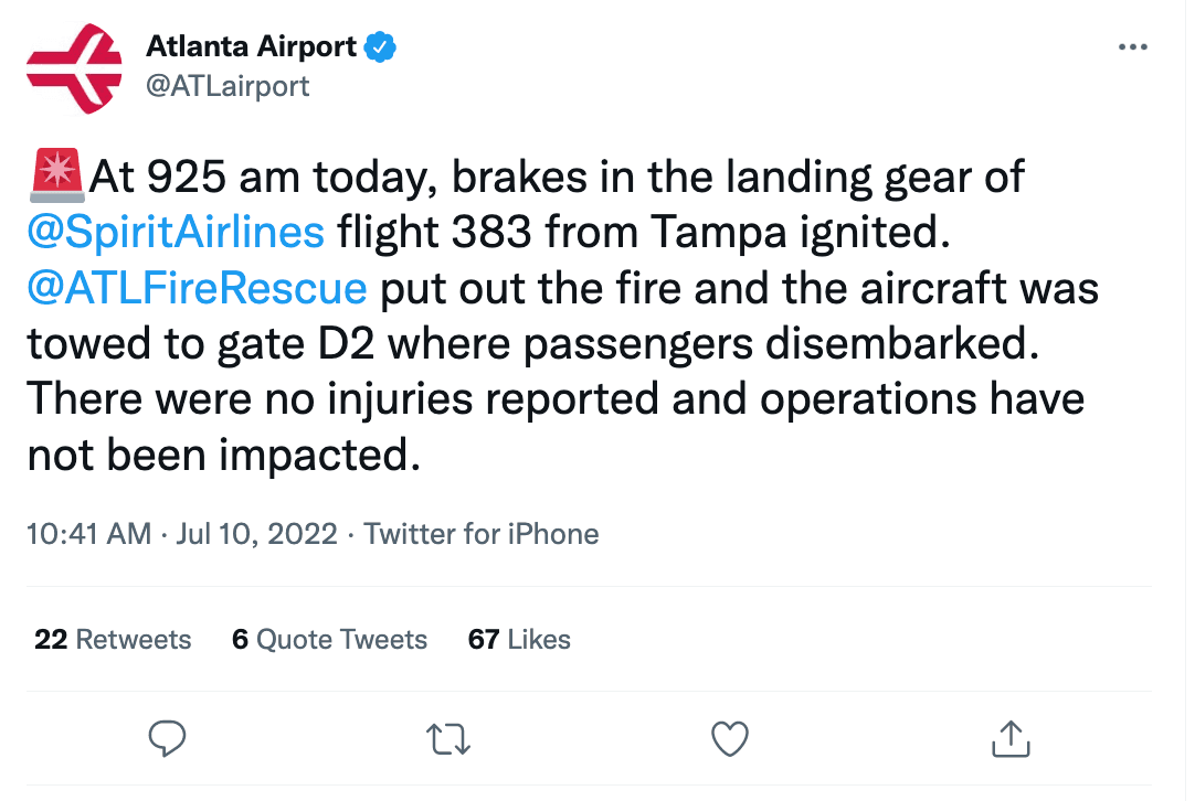 El vuelo 383 de Spirit Airlines, que despegó a las 8:05 de la mañana de Tampa tuvo problemas al aterrizar en el aeropuerto Hartsfield-Jackson de Atlanta, Georgia. Según la aerolínea, los frenos de la nave se sobrecalentaron, provocando un incendio que fue controlado.