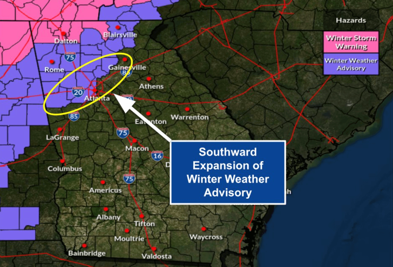 Este lunes 15 de enero, el NWS actualizó el mapa y agregó los condados de: Carroll, Paulding, Douglas, Cobb, Forsyth y Fulton.