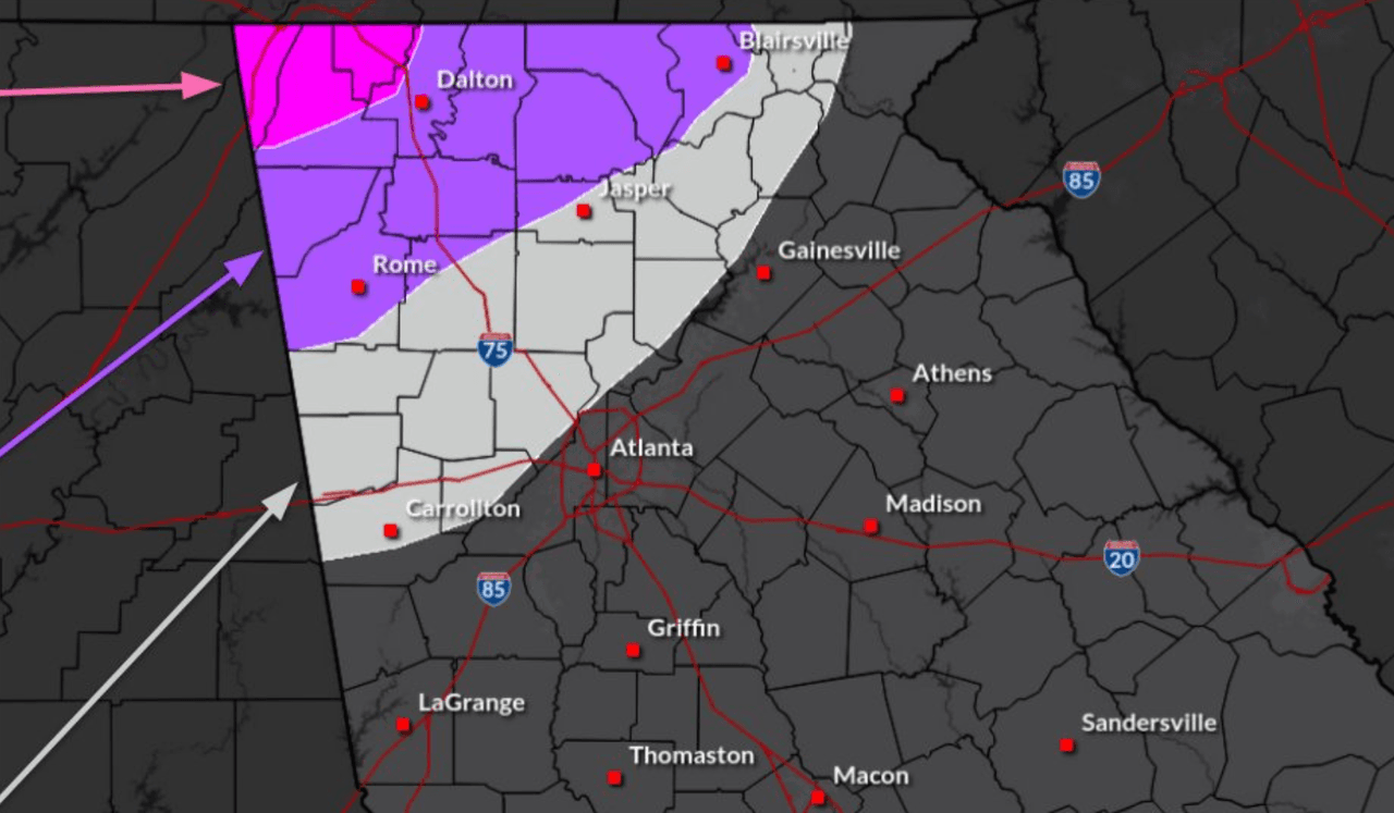 La zona de mayor riesgo (color rosa): esta región comprende a los condados de Dade, Walker y Catoosa. Se espera que la nieve comience la noche de este domingo y permanezca hasta la mañana del martes. Se anticipa que primero ocurra la nieve para después pasar a una convinación de granizo y lluvia helada.