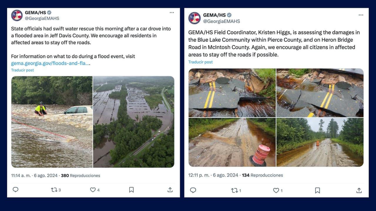 Imágenes compartidas por la Agencia de Manejo de Emergencias de Georgia (GEMA) también dieron a conocer un rescate debido a un vehículo en una carretera inundada en el Condado Jeff Davis.