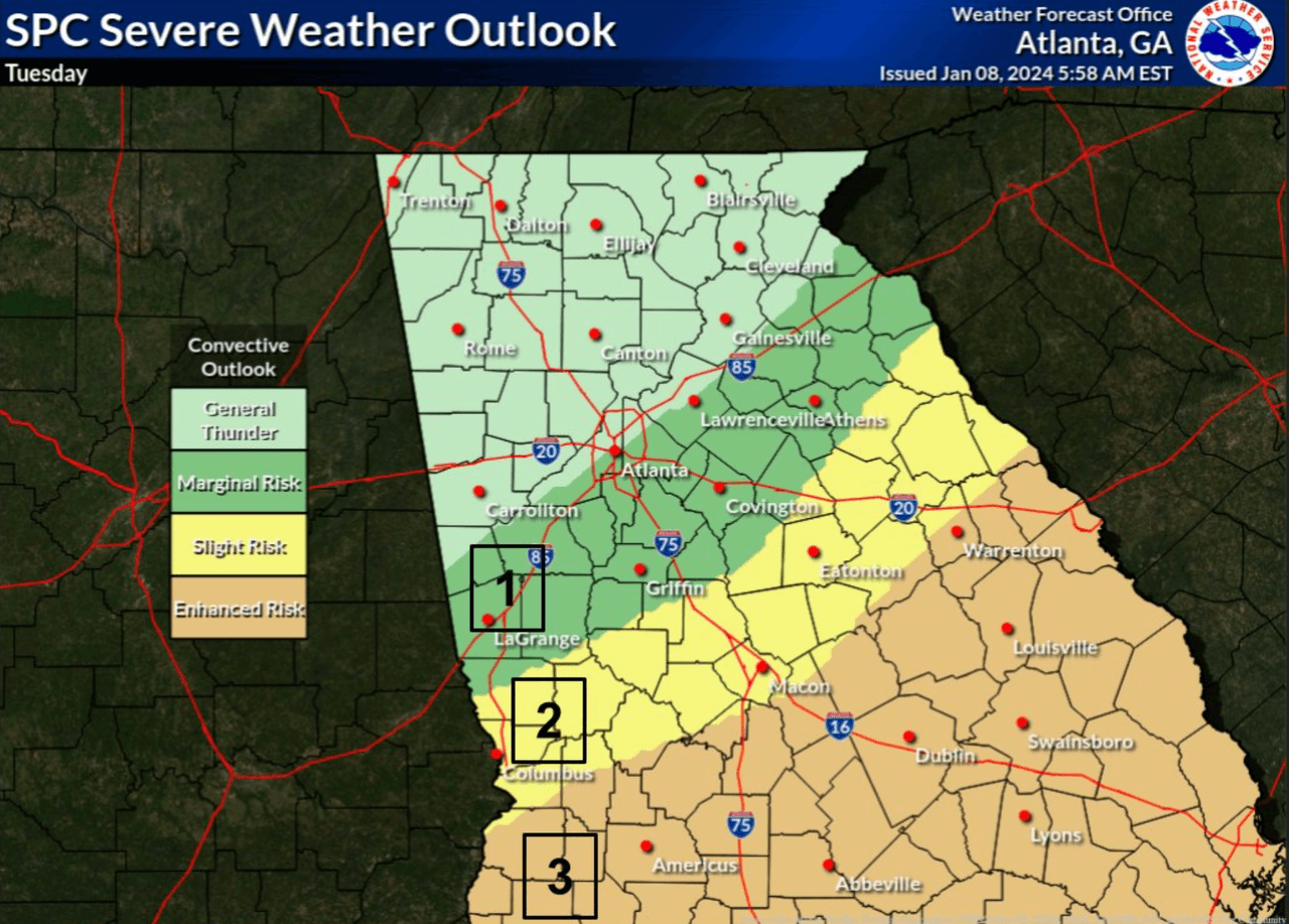 El Servicio Nacional de Meteorología (NWS) publicó un mapa de la posibilidad de tiempo severo en cada una de las regiones del estado. Una porción de metro Atlanta se encuentra en riesgo 1 de 5, al sur de Griffin está en riesgo 2 de 5 y Macon se encuentra en riesgo 3 de 5.