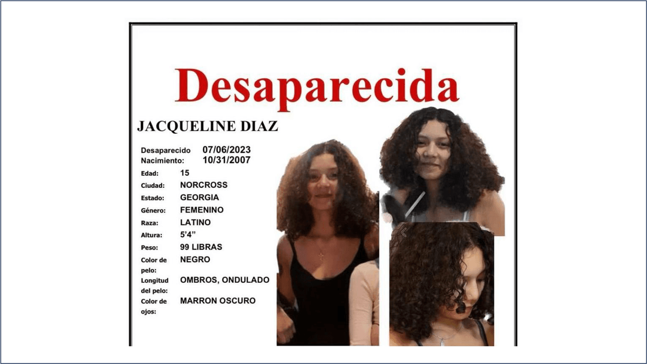 ATLANTA, Georgia.- Jacqueline Díaz, de 15 años, desapareció el 6 de julio cuando avisó que saldría a casa de un amigo. Desde ese día, su familia la busca en el norte de Georgia.