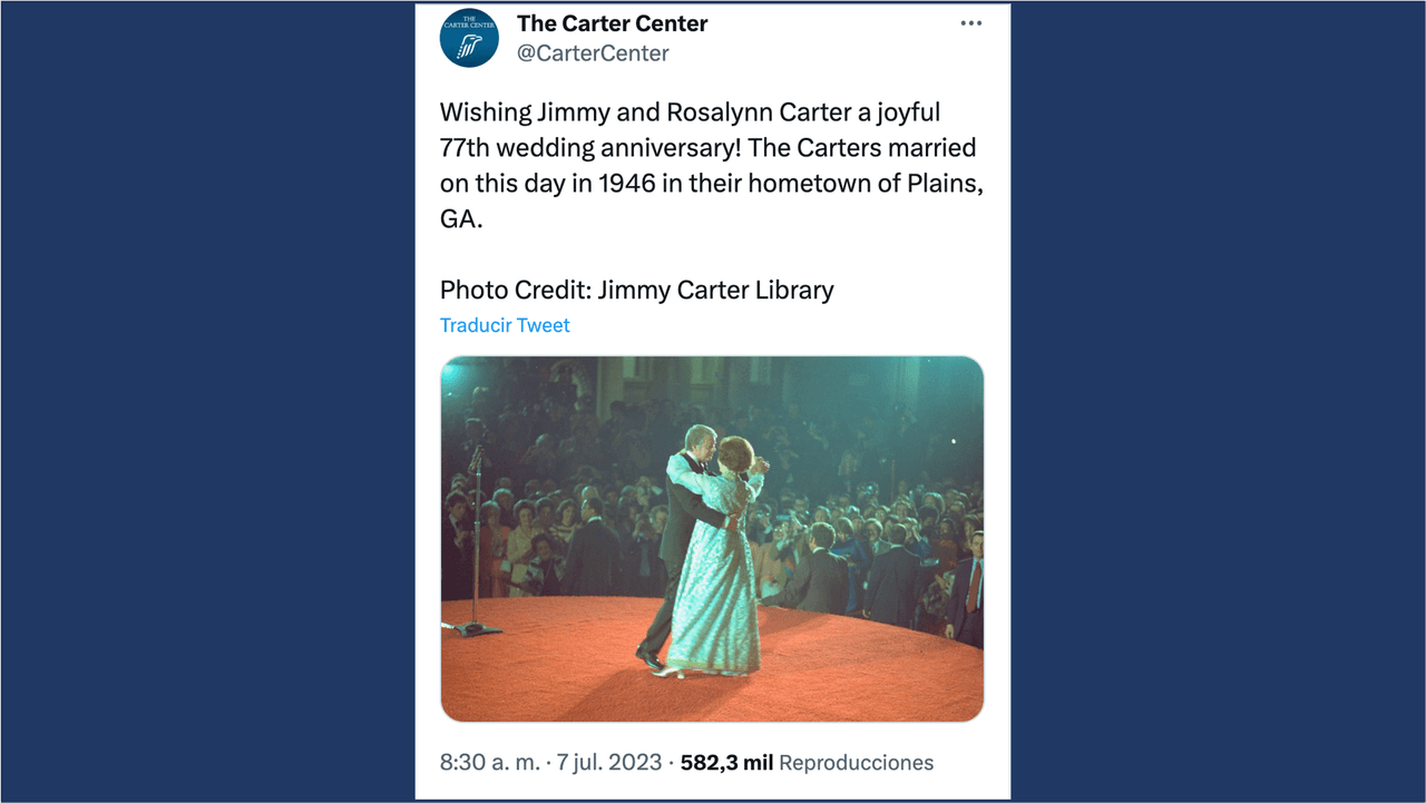 “Deseando a Jimmy y Rosalynn Carter un aniversario de bodas número 77 lleno de alegría”, publicó el Centro Carter.