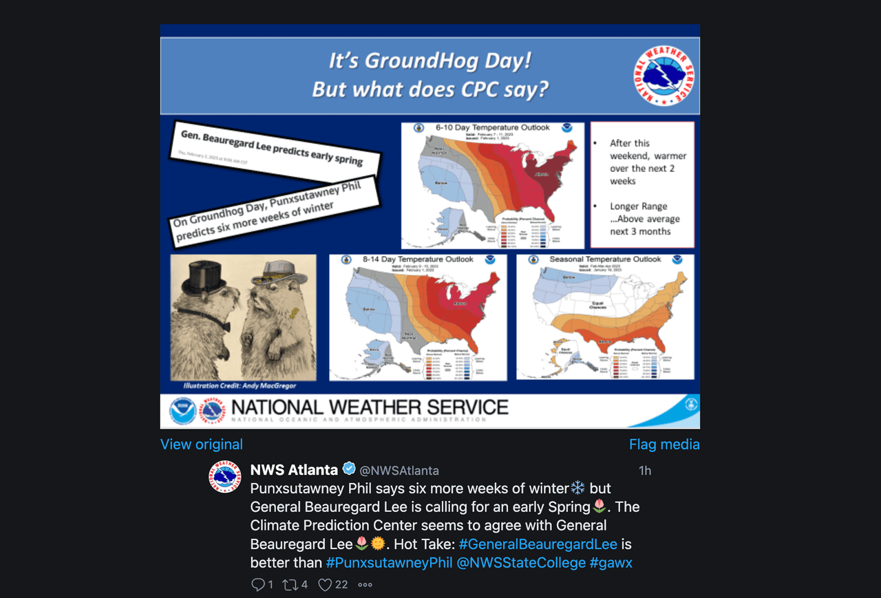 “Punxsutawney Phil dice seis semanas más de invierno❄️ pero el general ‘Beau’ Lee dijo que tendremos una primavera temprana🌷. El Centro de Predicción del Clima parece estar de acuerdo con el General Beauregard Lee🌷🌞”, publicaron en Twitter.