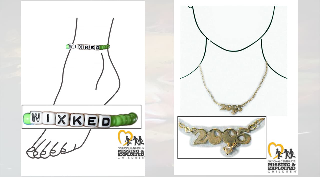 Este martes, publicaron un boceto actualizado e imágenes de un collar y una cadena de tobillo que la mujer usaba cuando fue encontrada. Llevaba un collar con "2005" y una tobillera con "Wixked".