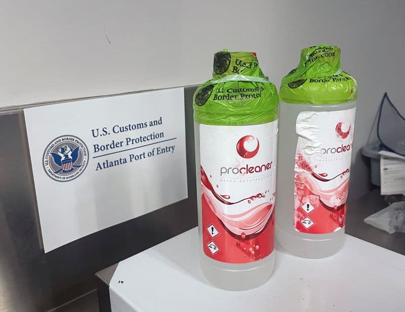 Oficiales de Aduanas y Protección Fronteriza de los Estados Unidos (CBP), en Atlanta, describieron el hallazgo, realizado el 21 de agosto, como “más de cinco libras de gamma butirolactona (GBL), un solvente químico industrial y un precursor químico del peligroso ácido gamma-hidroxibutírico (GHB)”.
