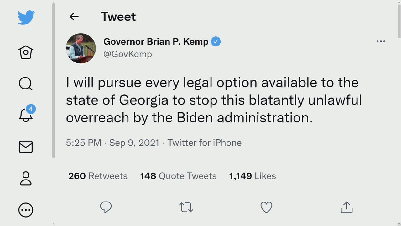 Tras el anuncio del presidente de EEUU Joe Biden sobre el mandato de vacunación a empresas con más de 100 empleados, el gobernador de Georgia calificó la media como “extralimitación ilegal”.