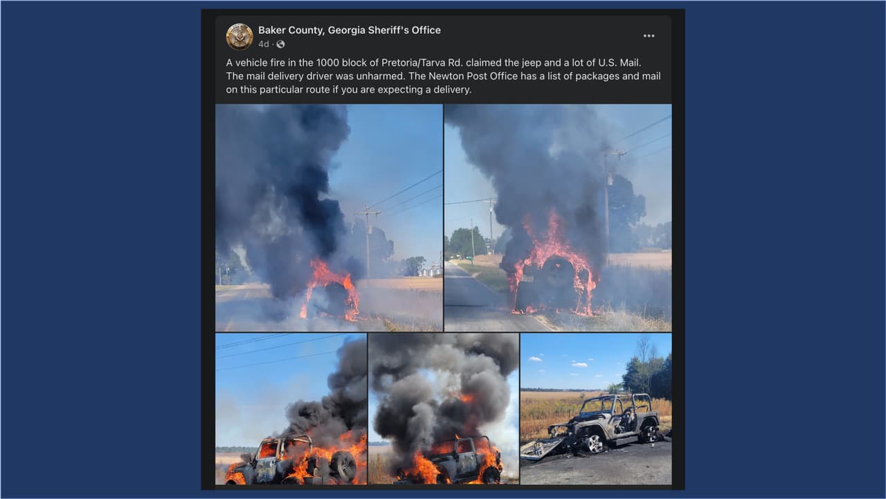 ATLANTA, Georgia. – La Oficina del Alguacil del condado Baker publicó recientemente una serie de fotografías que mostraban un jeep del Servicio Postal de Estados Unidos en llamas. Las imágenes causaron controversia luego de que se reportara que en dicho condado había 43 boletas electorales pendientes de llegar y se sospechara que eran transportadas en ese auto.