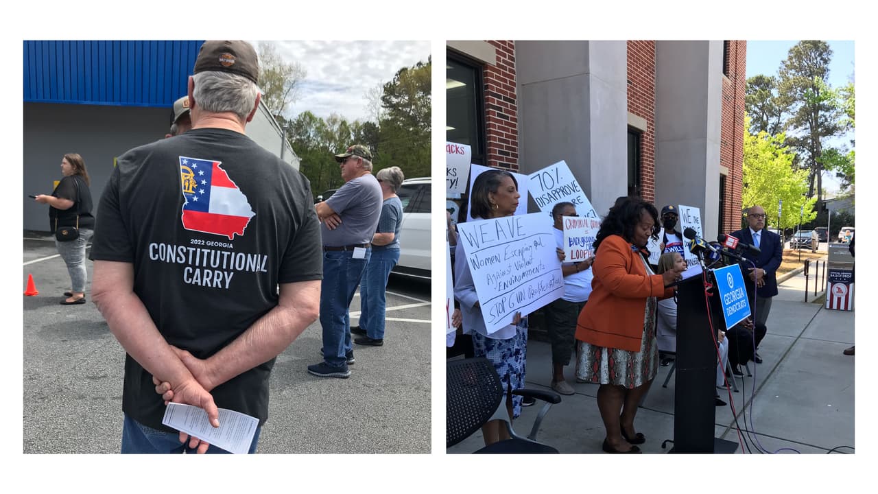 Un grupo de representantes del Partido Demócrata realizó una protesta en contra de la firma de la ley que permitirá el porte de armas sin licencia en todo Georgia. Minutos después, el gobernador Brian Kemp firmó la medida afuera de una tienda de armas en Douglasville.