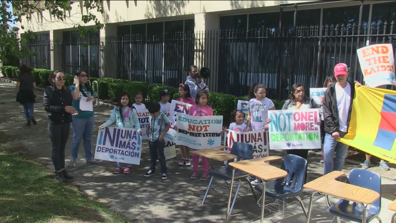 Organizaciones y padres de familias protestaron a las afueras de la sede demócrata en Atlanta para pedir un alto a las redadas de ICE en contra de estudiantes hispanos.