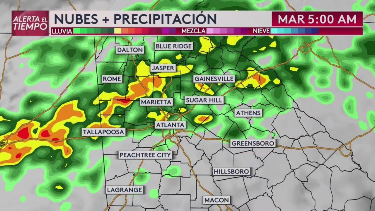 Una línea de tormentas estará atravesando el centro y norte de Georgia generando fuertes vientos y alta probabilidad de tormentas eléctricas. La lluvia se mantendrá hasta pasada la media noche.