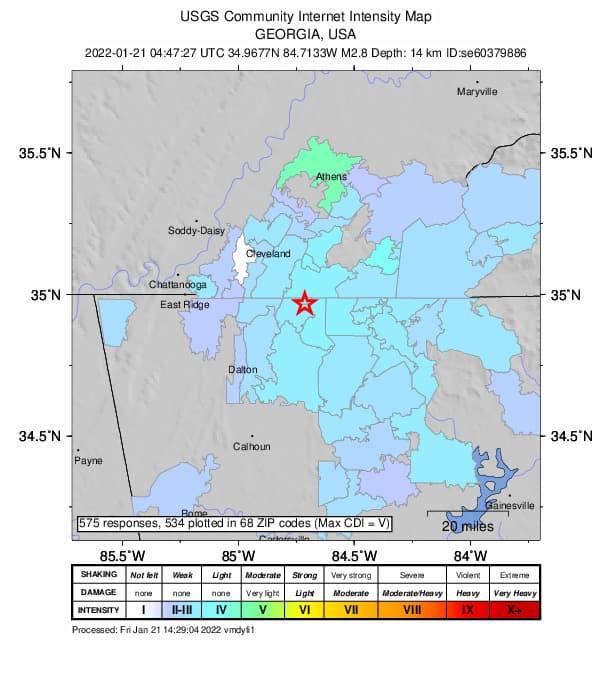 El centro del terremoto se registró cerca de la frontera estatal entre Georgia y Tennessee.