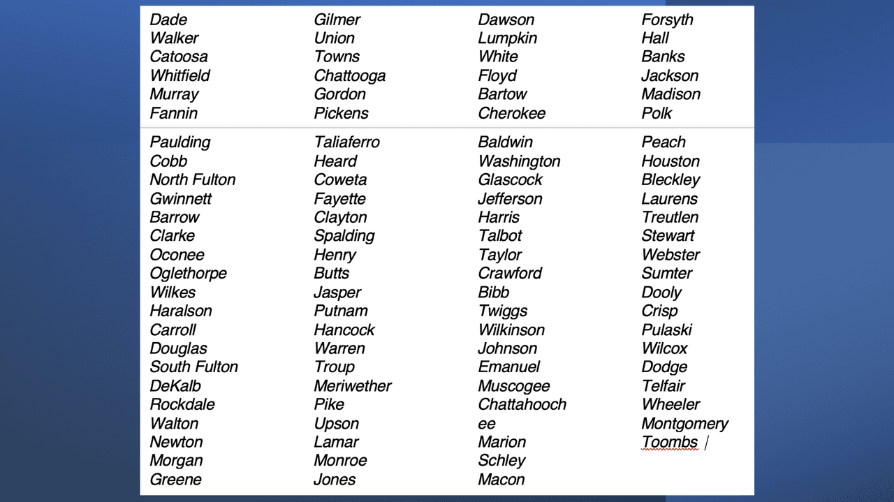 Las ciudades más afectadas son: Calhoun, Dahlonega, Cleveland, Roma, Cartersville, Gainesville, Marietta, Atlanta, Lawrenceville, Atenas, Carrollton, Douglasville, East Point, Decatur, Conyers, Covington, Newnan, Peachtree City, Griffin, Milledgeville, Macon, Swainsboro, Columbus, Warner Robins, Dublín, Lumpkin, Americus, Cordele y Vidalia.