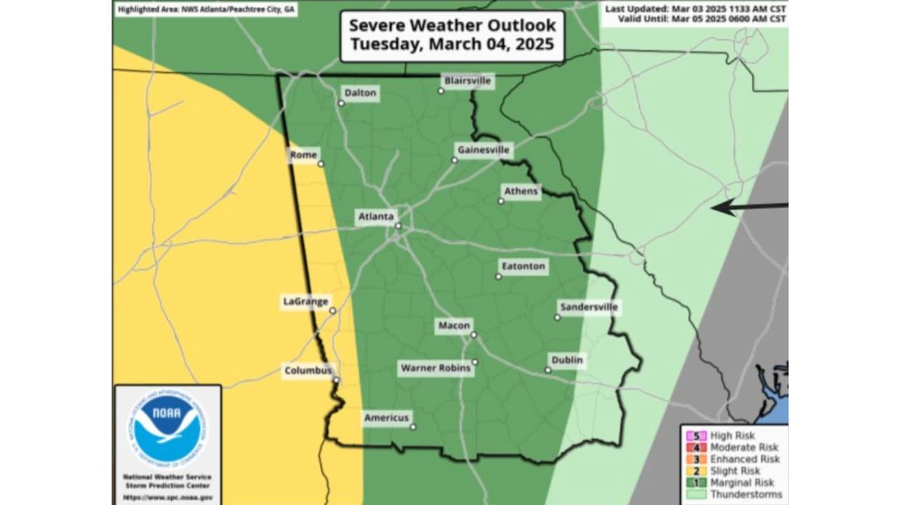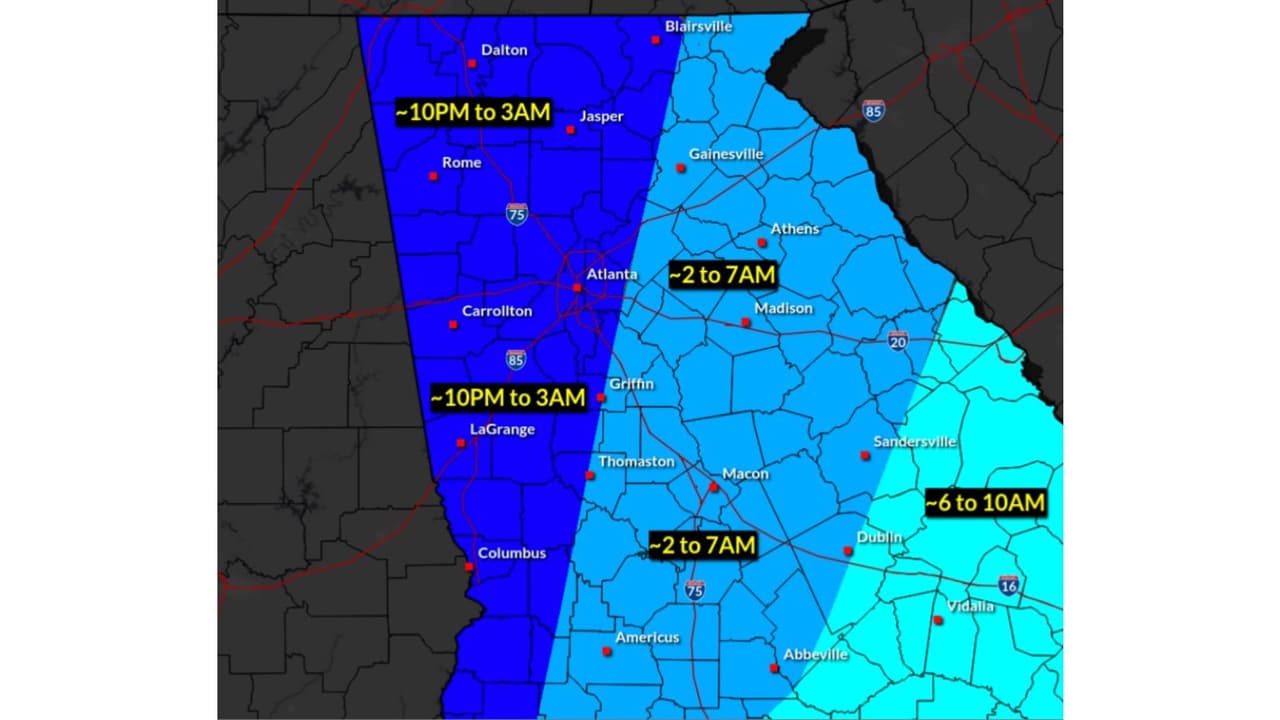 La zona bajo mayor riesgo es la franja oeste del estado, de Rome a Lagrange y Columbus, a partir de las 10:00 p.m. de este martes 4 de marzo hasta las 7:00 a.m. del miércoles 5 de marzo.