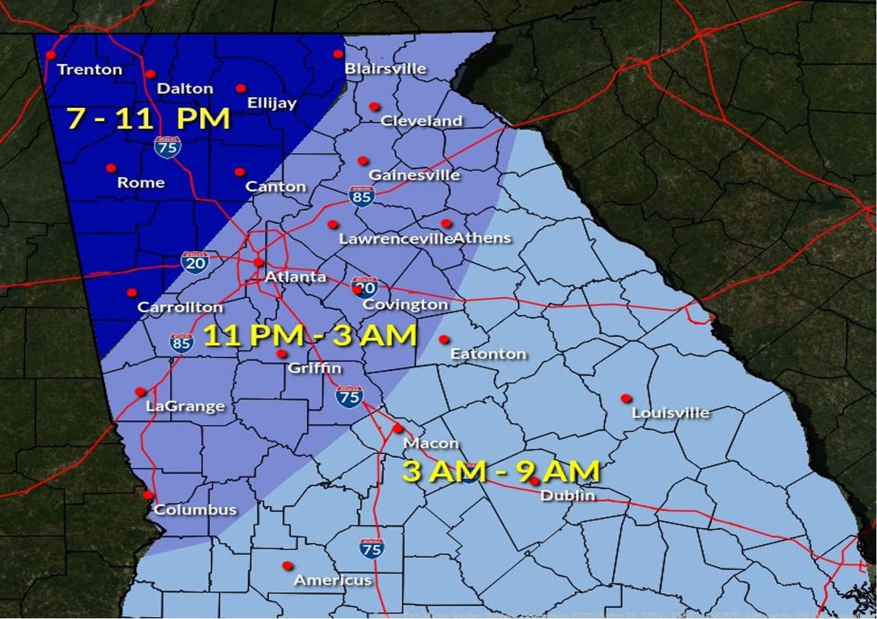 Para la zona al sur de Atlanta, a partir de Macon, se prevé que las lluvias inicien a las 3:00 a.m. y puedan terminar hasta las 9:00 a.m. del viernes.