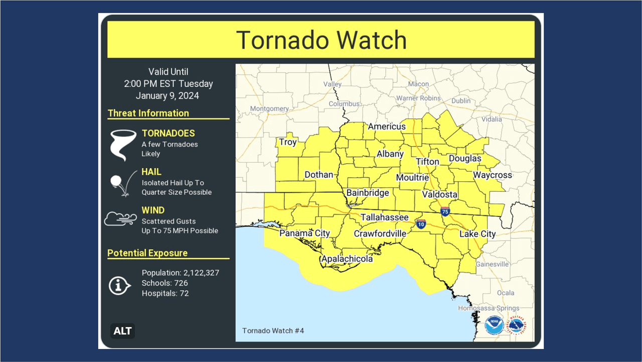 Emiten una vigilancia por tornado para una porción de Georgia, Alabama y Florida