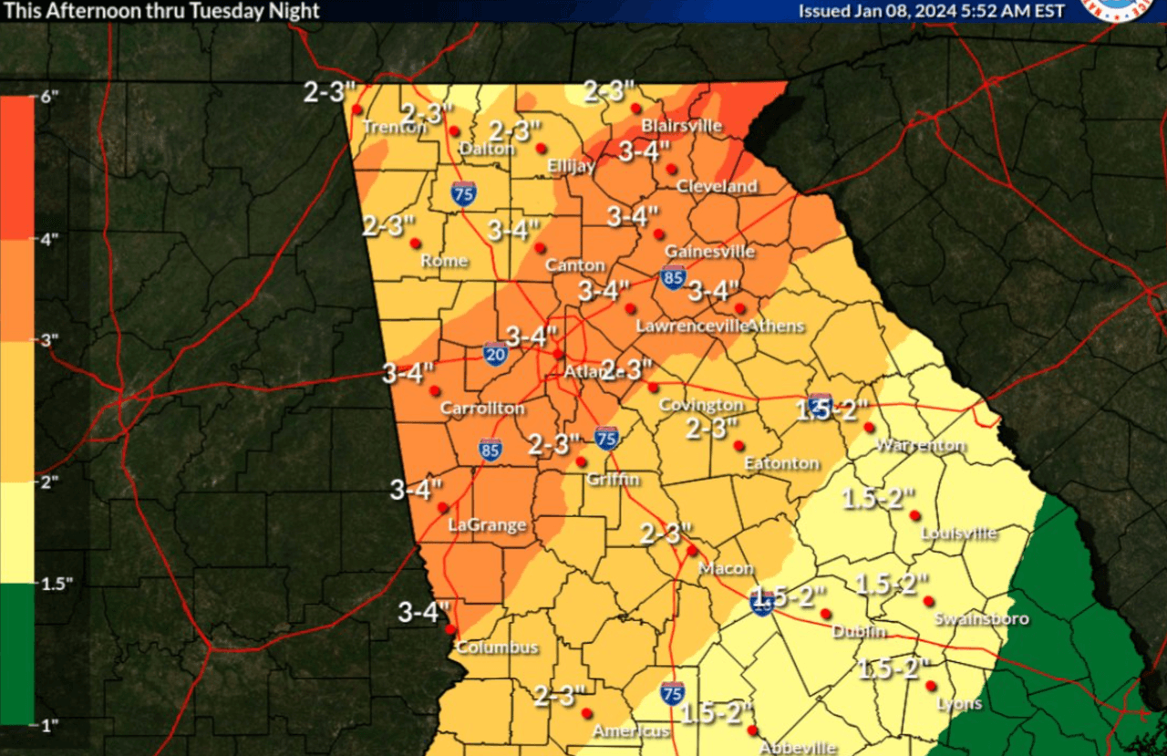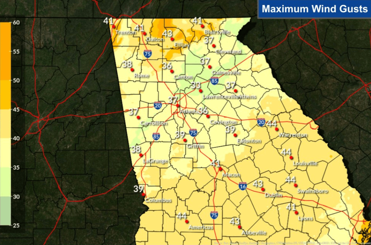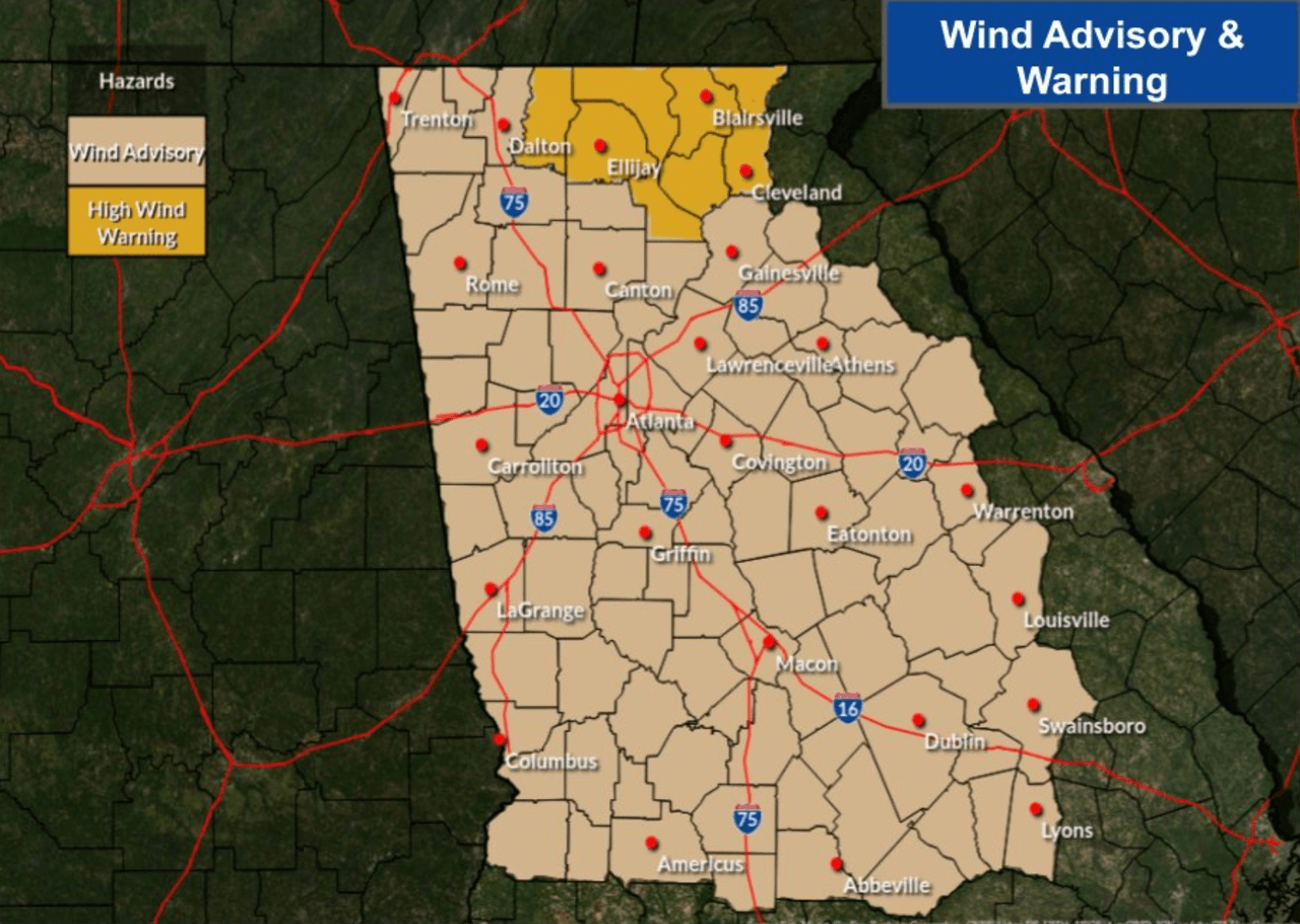 El Servicio Nacional de Meteorología (NWS) publicó un mapa de la posibilidad de tiempo severo en cada una de las regiones del estado. Una porción de metro Atlanta se encuentra en riesgo 1 de 5, al sur de Griffin está en riesgo 2 de 5 y Macon se encuentra en riesgo 3 de 5.