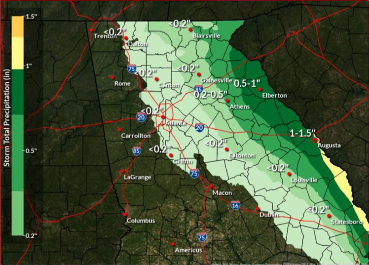 Las cantidades más grandes de lluvia serán de hasta 1.5 pulgadas en el extremo este de Georgia. Se esperan lluvias principalmente en los condados del este especialmente a partir de la mañana de este viernes y hasta el sábado.