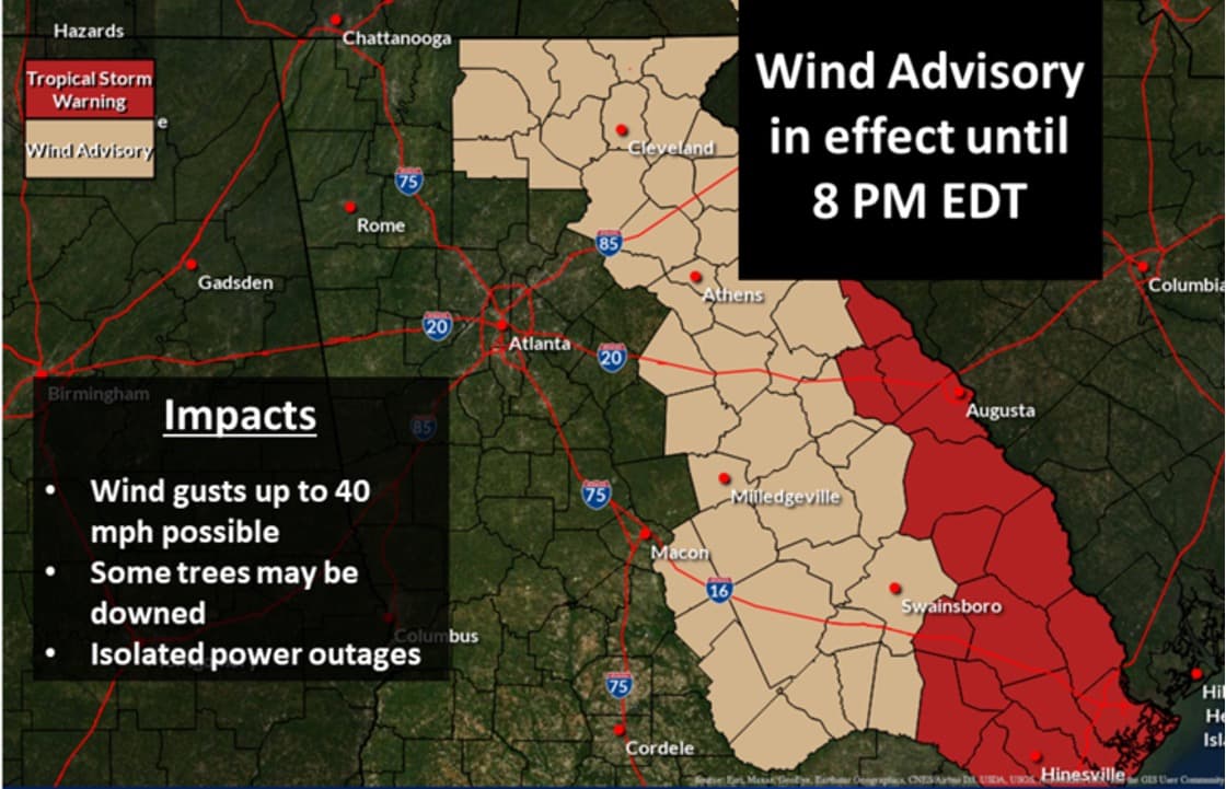 Un aviso de viento está vigente hasta las 8:00 p. m. de este viernes para gran parte del este de Georgia. Es posible que se produzcan ráfagas de viento de hasta 40 mph, lo que provocará la caída de algunos árboles y líneas eléctricas. Los cortes de energía aislados son posibles.