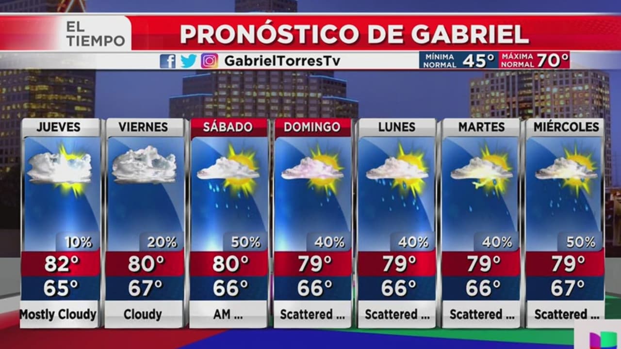 Prepárese porque se espera un día nublado en la región y con posibilidad de lluvia ligera, se espera que el termómetro alcance una máxima de 82 grados Fahrenheit.