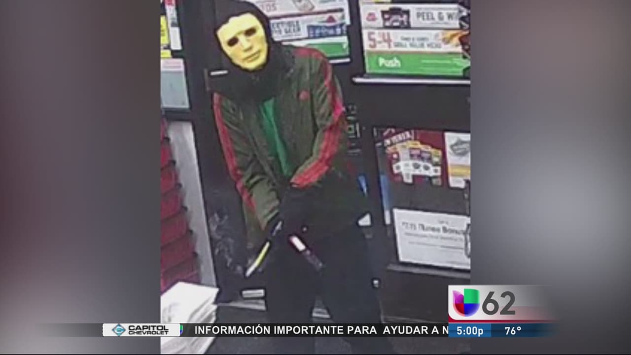 La policía buscan a un sujeto que entra a gasolineras utilizando una máscara amarilla, un martillo en mano y enciende una luz de bengala que carga hasta el final del robo.