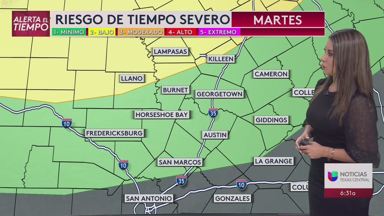 La mayor parte del área de Edwards Plateau, Hill Country y Austin permanece en riesgo marginal de clima severo, con solo los condados lejanos de Northern Llano y Burnet en riesgo leve (nivel 2 de 5).