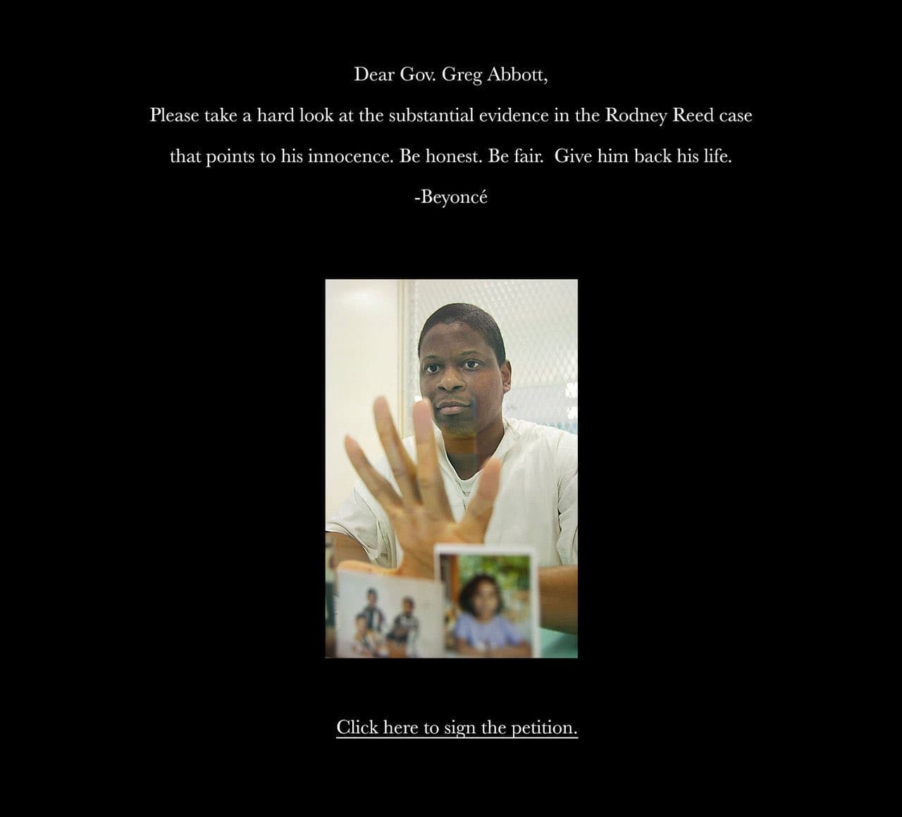 BASTROP, Texas- La estrella Beyoncé firmó y compartió una petición en su sitio web en apoyo de Rodney Reed y para evitar su ejecución que se llevará a cabo en dos semanas.