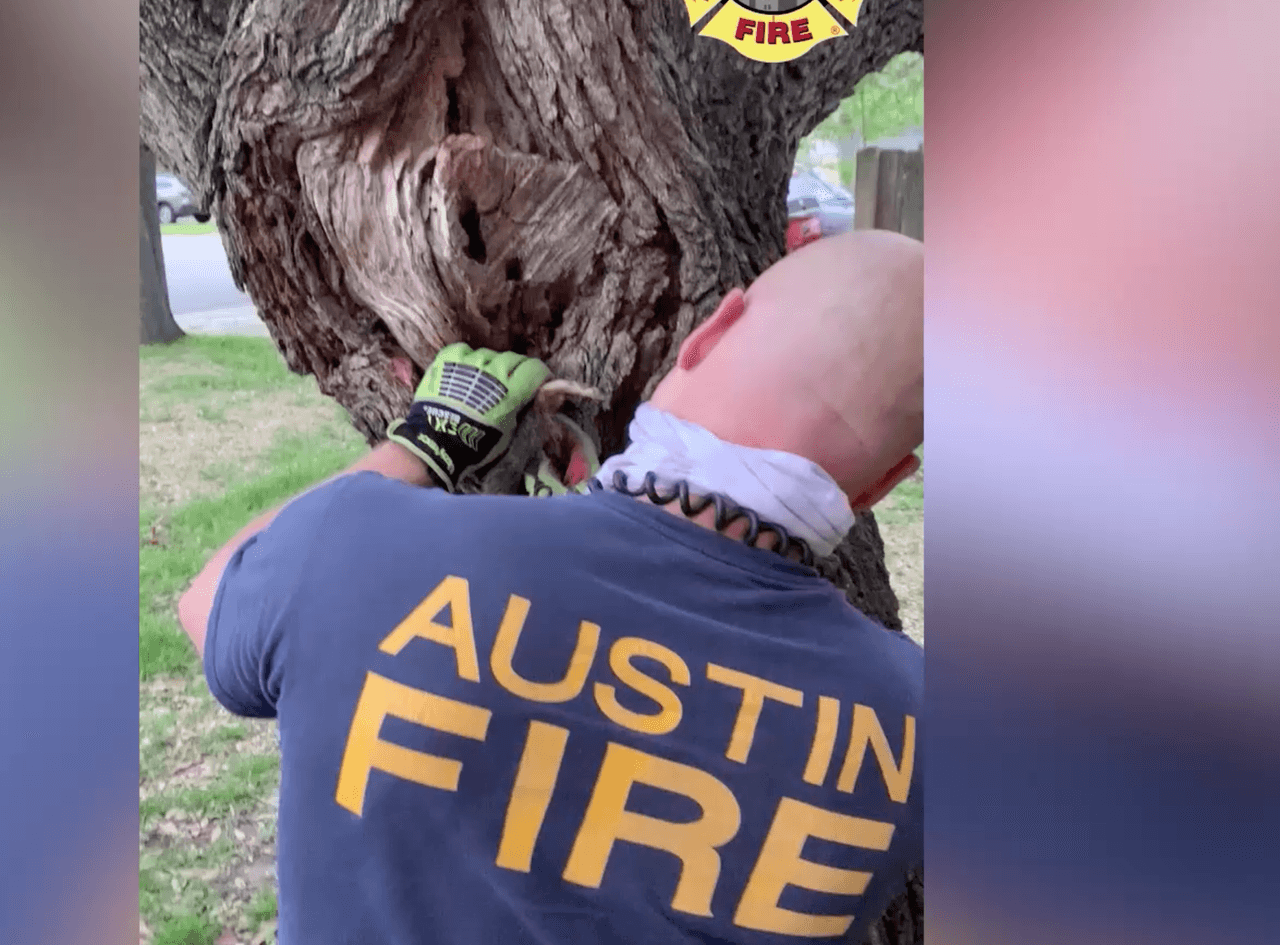El Departamento de Bomberos en Austin respondió a una angustiada llamada al 911 que había informado del caso de una ardilla que de alguna manera había logrado que su cabeza se atascara en el agujero de un árbol y no podía liberarse. La persona que llamó estaba muy preocupada ya que la ardilla aparentemente había estado allí durante algún tiempo, así que los bomberos decidieron ayudar.