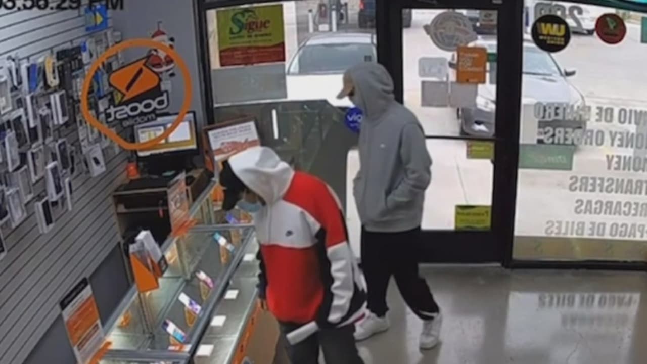 La policía está tras la pista de dos hombres aparentemente hispanos acusados de asaltar una tienda a mano armada, cámaras de seguridad grabaron el momento. Si los identifica, denúncielos.
