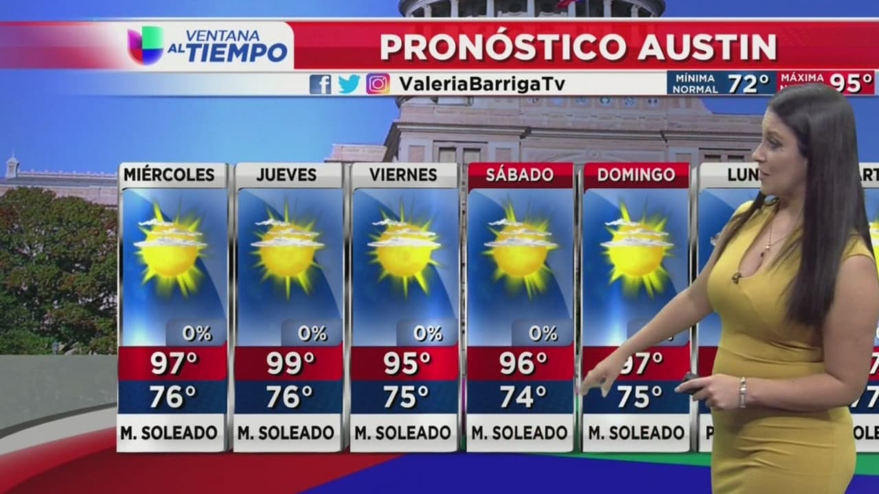 ¡Mantente hidratado y viste colores claros! El cielo estará mayormente soleado durante el día a medida que las temperaturas suban a alrededor de 96 grados con índices de calor hasta los 110 grados en algunas regiones del centro de Texas, según el Servicio Nacional de Meteorología.