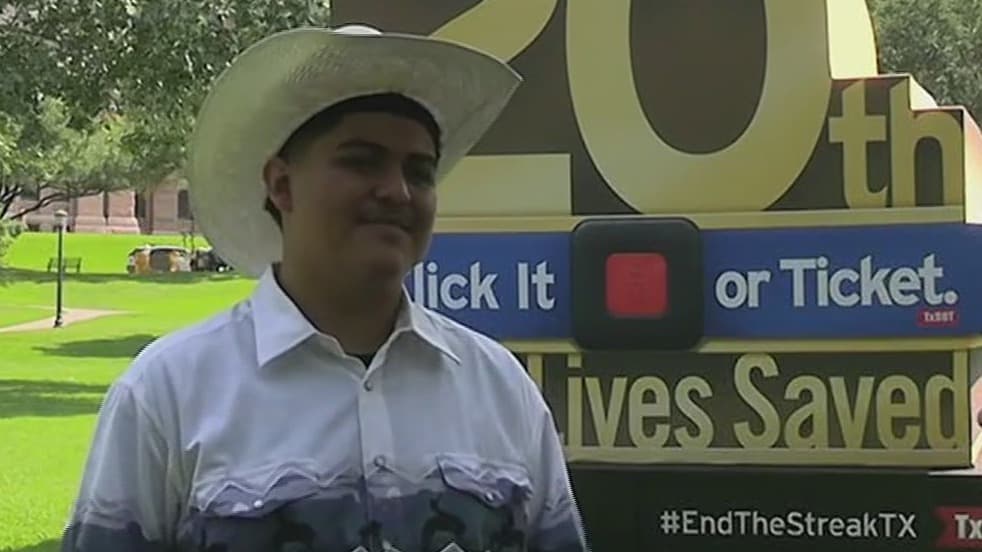 Riley León, el joven de 16 años que sobrevivió a un tornado en Manor al permanecer dentro de su camioneta y usar el cinturón de seguridad, es la nueva imagen de la campaña ‘Click it or Ticket’ que cumple 20 años de trabajo para reducir el número de muertes en carreteras.