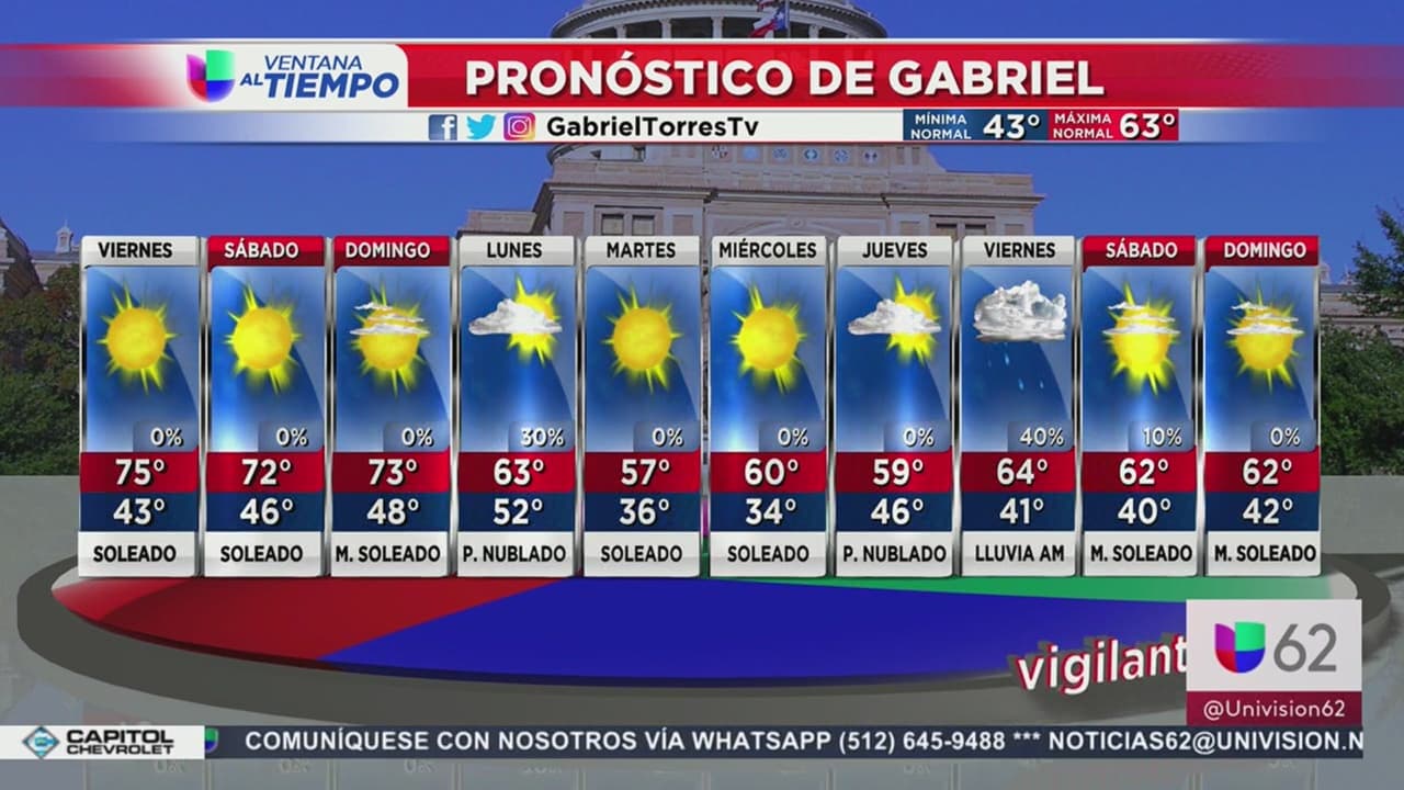 Se prevé un día con cielos despejados y condiciones secas en la capital texana, con temperaturas mínimas de 43°F y máximas de 73°F. Manténgase abrigado.