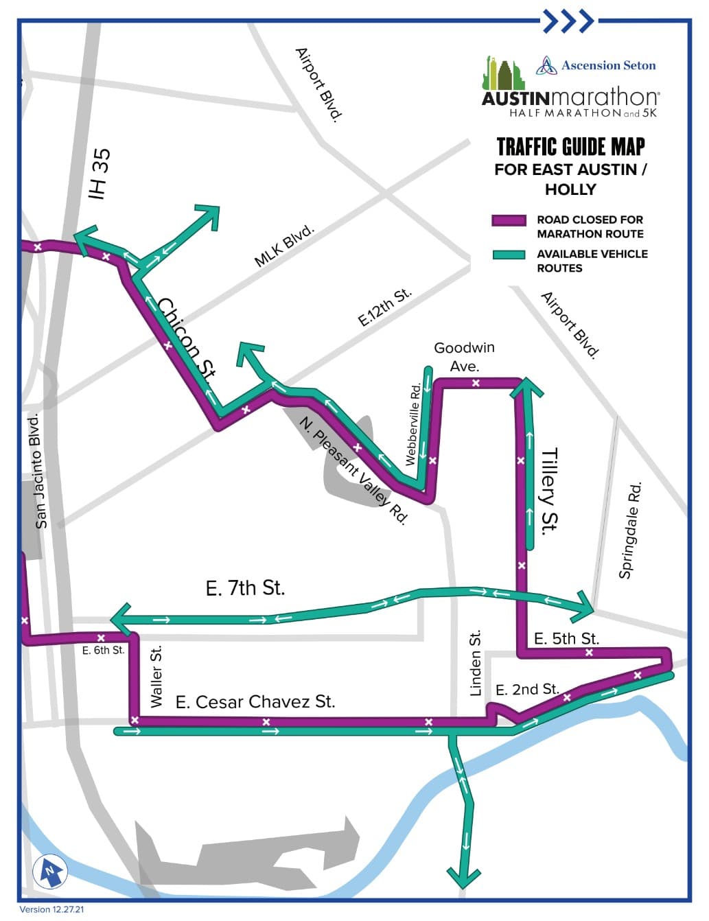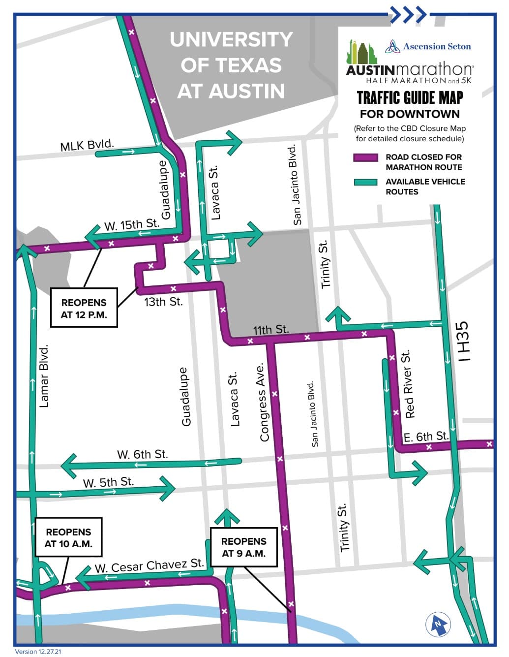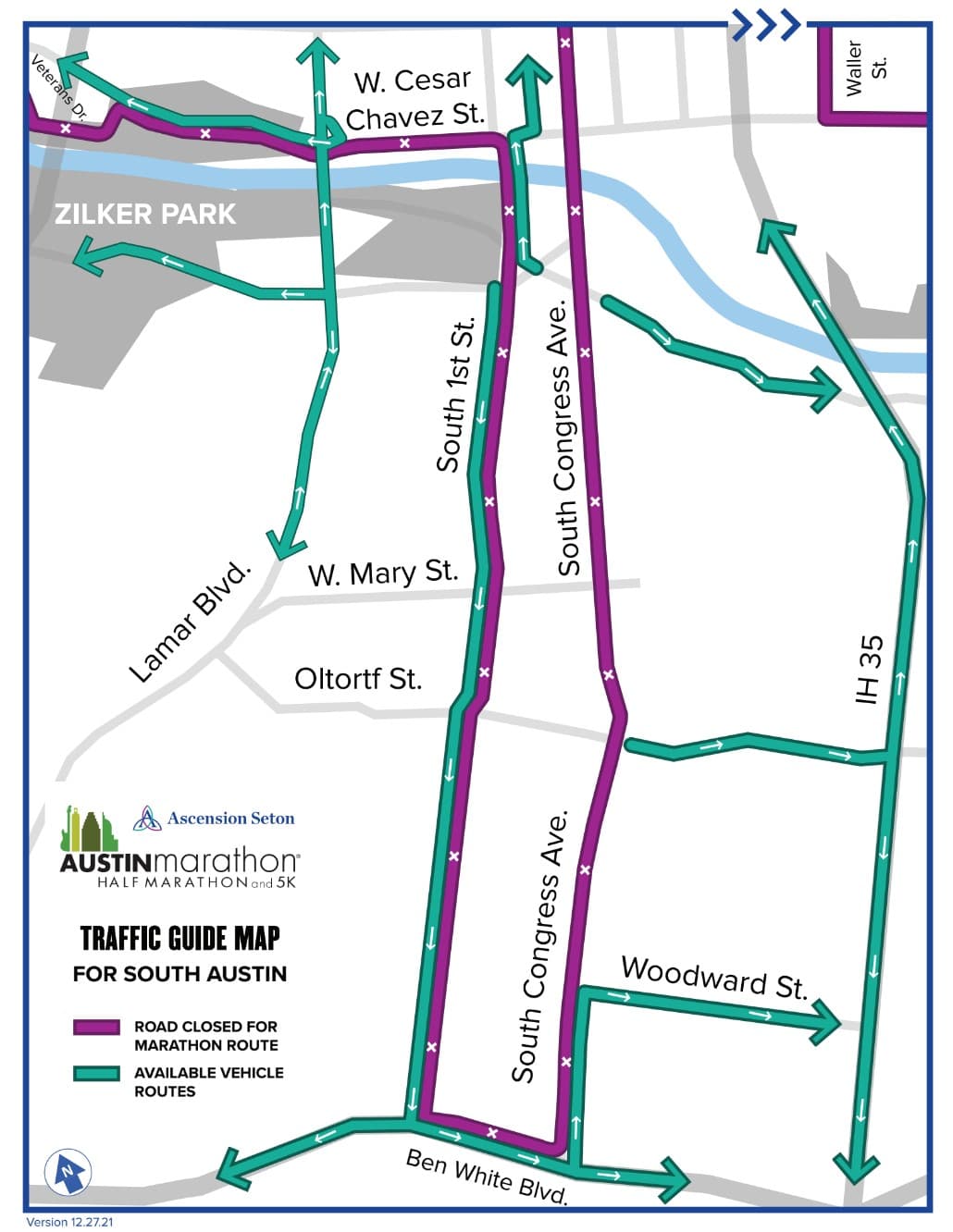 La ciudad de Austin cerrará todas las carreteras utilizadas en la ruta para el maraton desde a las 6:00 a.m. para asegurar que el curso está listo para los corredores. El recorrido de cruces del recorrido en las intersecciones principales permanecerá abiertos hasta justo antes de la llegada del primer corredor, estarán cerrados mientras crucen los corredores.
