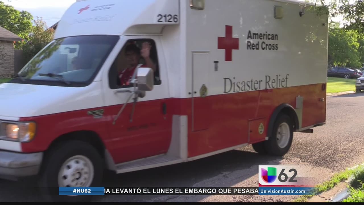 Tras las lluvias e inundaciones que afectaron el condado Travis, voluntarios de la Cruz Roja prestó ayuda a las familias que perdieron sus pertenencias.
