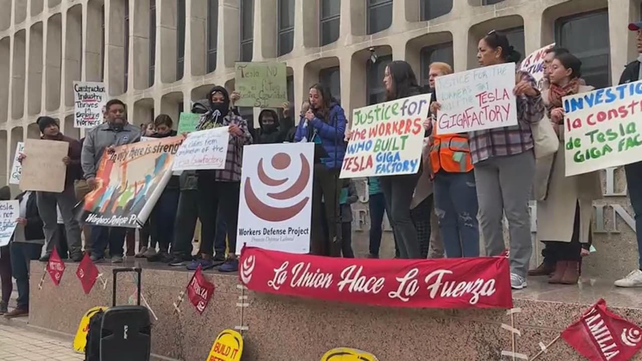 Decenas de empleados se manifestaron para denunciar una serie de supuestas violaciones laborales durante la construcción de fábrica de Tesla, entre las que se incluye falta de pago de horas extras.