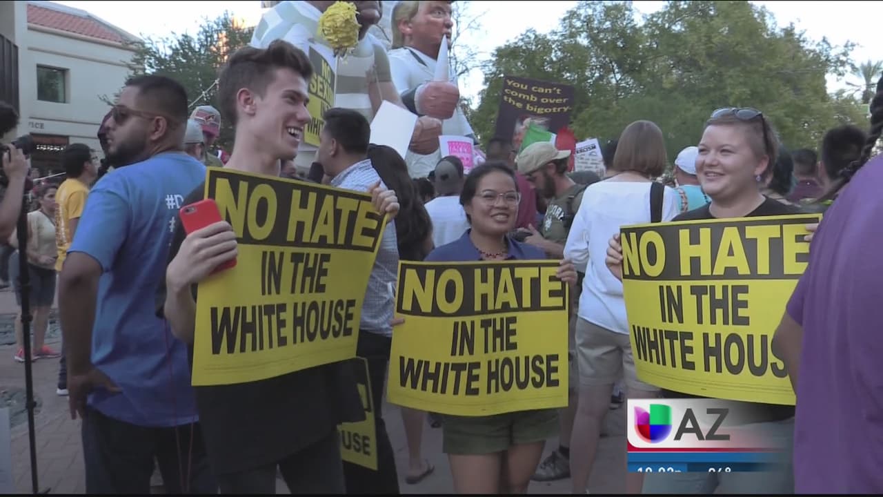 Decenas de personas, organizaciones pro inmigrantes y activistas se manifestaron afuera del centro de convenciones de Phoenix, contra el plan migratorio del candidato republicano Donald Trump.