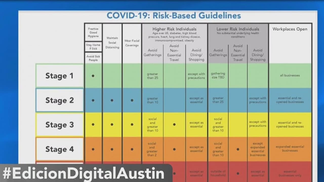 El Departamento de Salud Pública de Austin publica una tabla codificada por colores para mostrar las etapas de riesgo del coronavirus y proporcionar recomendaciones a la población de los cuidados que deben tener en cada fase.