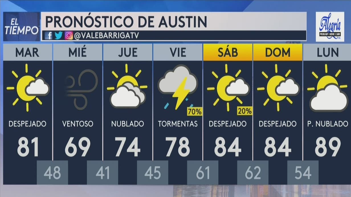 Espera cielos mayormente despejados con temperaturas alrededor de los 75 grados Fahrenheit. Se espera que el frente frío atraviese Austin a partir de este martes.
