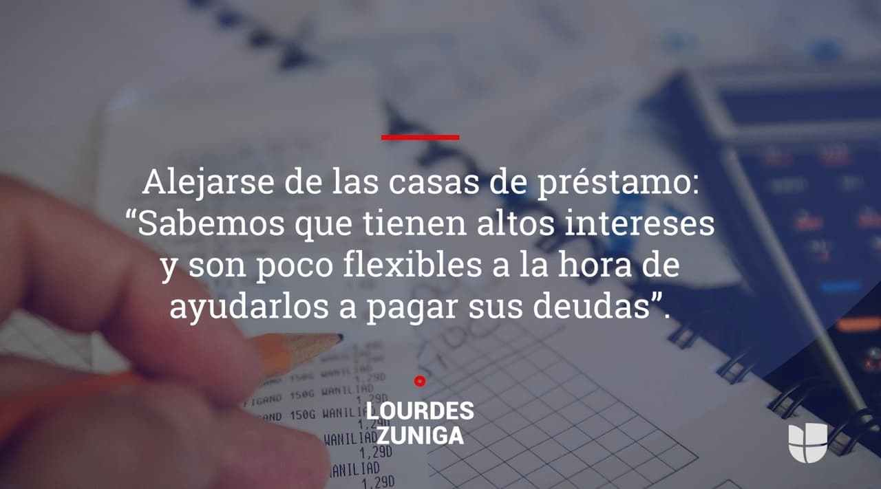 Alejarse de las casas de préstamo: “Sabemos que tienen altos intereses y son poco flexibles a la hora de ayudarlos a pagar sus deudas”. Zuniga indicó que no se debe buscar un préstamo en estos momentos para pagar alguna deuda.
