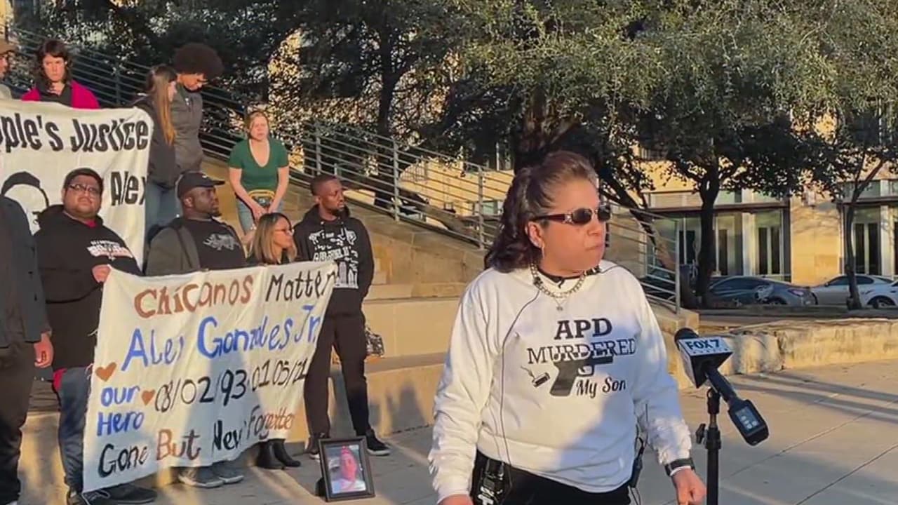Un grupo de manifestantes se reunieron para protestar por la muerte de Alex Gonzales a manos de la policía y la decisión de no enjuiciar a los dos oficiales involucrados.